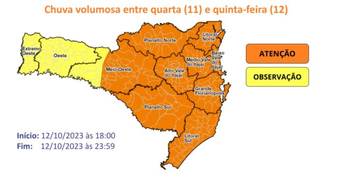ntre quarta (11) e ao longo da quinta-feira (12) as chuvas persistem em toda Santa Catarina. O somatório dos acumulados provocados pelos temporais e pela chuva persistente são elevados em todo o estado, marcando valores entre 70 e 100 mm nas áreas em laranja, que compreendem as áreas do Meio Oeste, Planaltos, em todo o Vale do Itajaí, Litoral Sul, Grande Florianópolis e Litoral Norte.