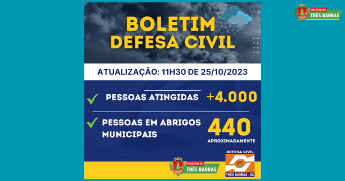 De segunda até a manhã desta quarta-feira, 25, mais de 600 pessoas deixaram os abrigos públicos mantidos pela Prefeitura de Três Barras. Há ainda nove locais abertos na cidade, com aproximadamente 440 abrigados. Um novo abrigo deve ser desmobilizado nesta tarde.